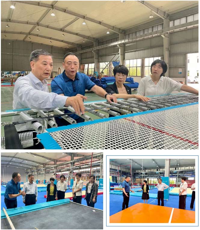 鲍学军一行先后参观了金耐斯体育训练场馆、产品展示厅、蹦床制造车间、体操产品制造车间、实验室等,详细了解金耐斯体育产品及发展历史,他对金耐斯紧跟市场要求,走出自主创新,高质量发展之路表示充分肯定。