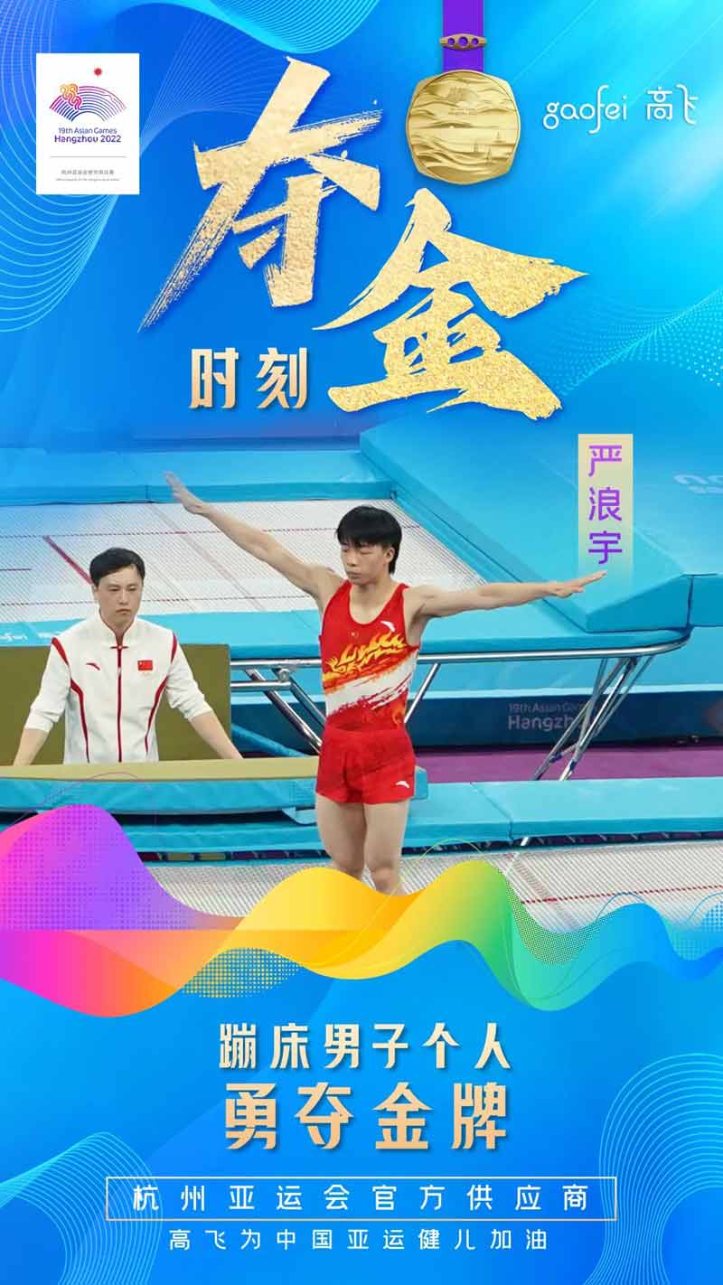 世界级器材品牌高飞的蹦床也如中国蹦床队的双保险在亚运赛场以优秀且稳定的冠军品质征服世界各国的运动员,收到了广泛的赞誉。高飞专业的赛事保障团队圆满完成杭州亚运会蹦床比赛保障。